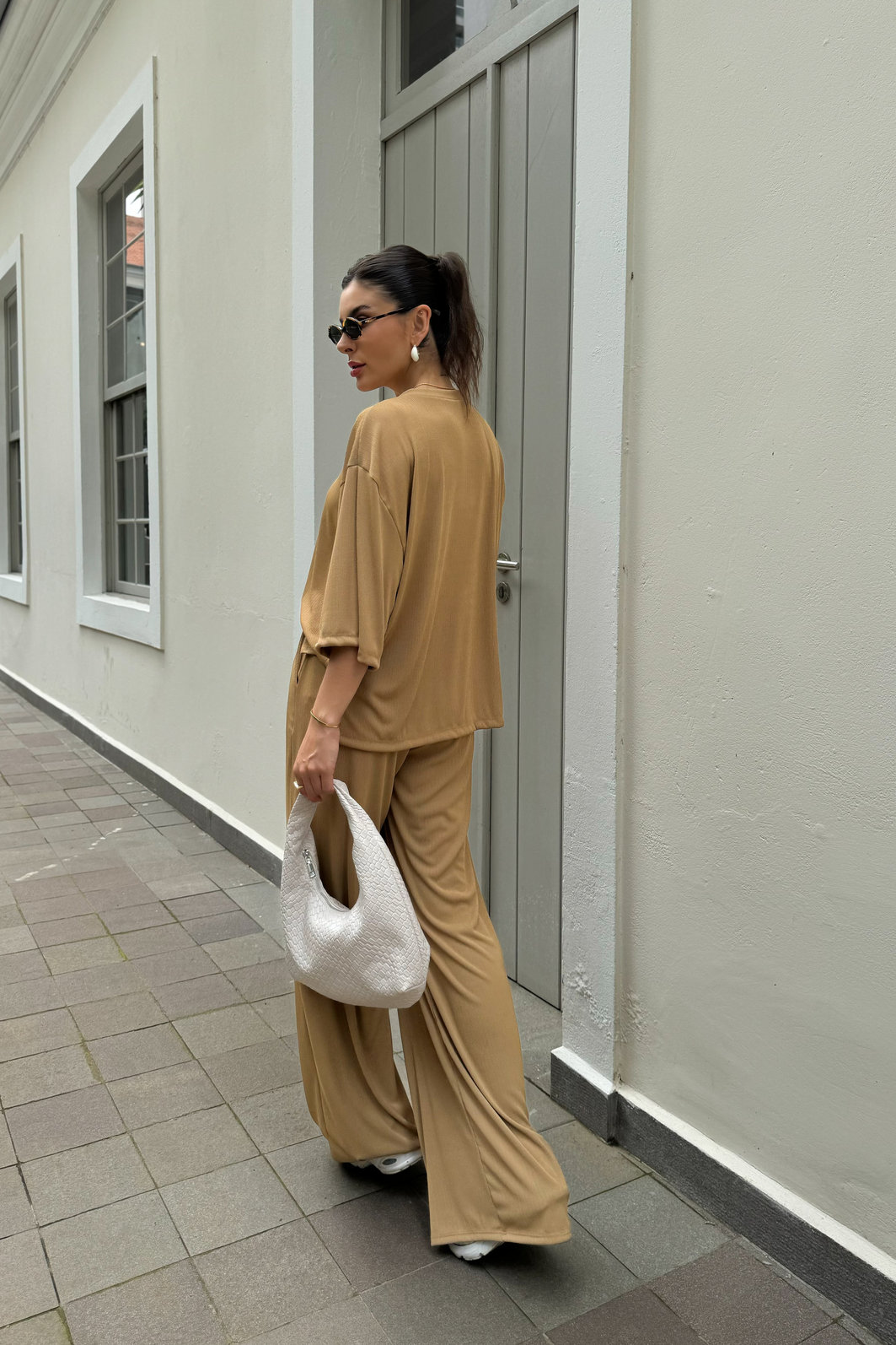 Confeccionado em malha texturizada com elastano, tem toque macio e caimento fluido. A blusa tem shape oversized, ombros deslocados e mangas amplas, criando um efeito despretensiosamente chic.