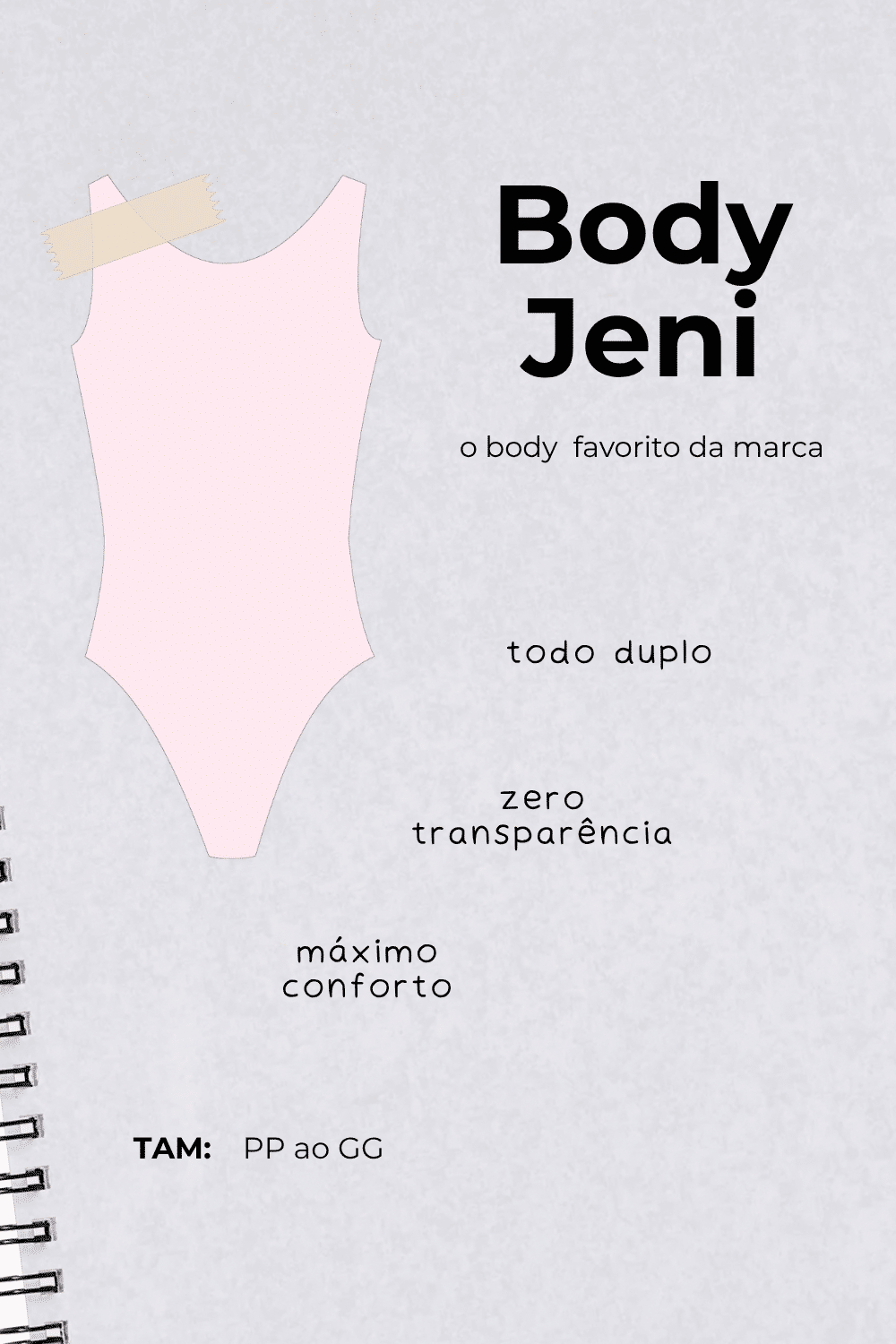 - Modelagem: body bem justo ao corpo, decote redondo e com modelagem nadador com cava mais profunda, que valoriza os ombros e alonga a silhueta