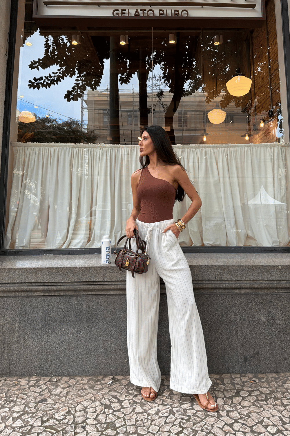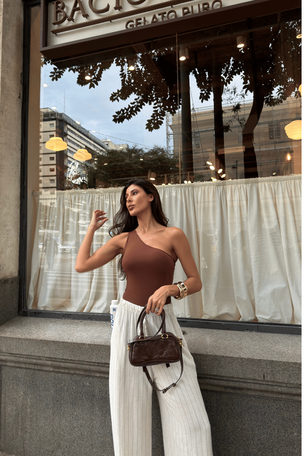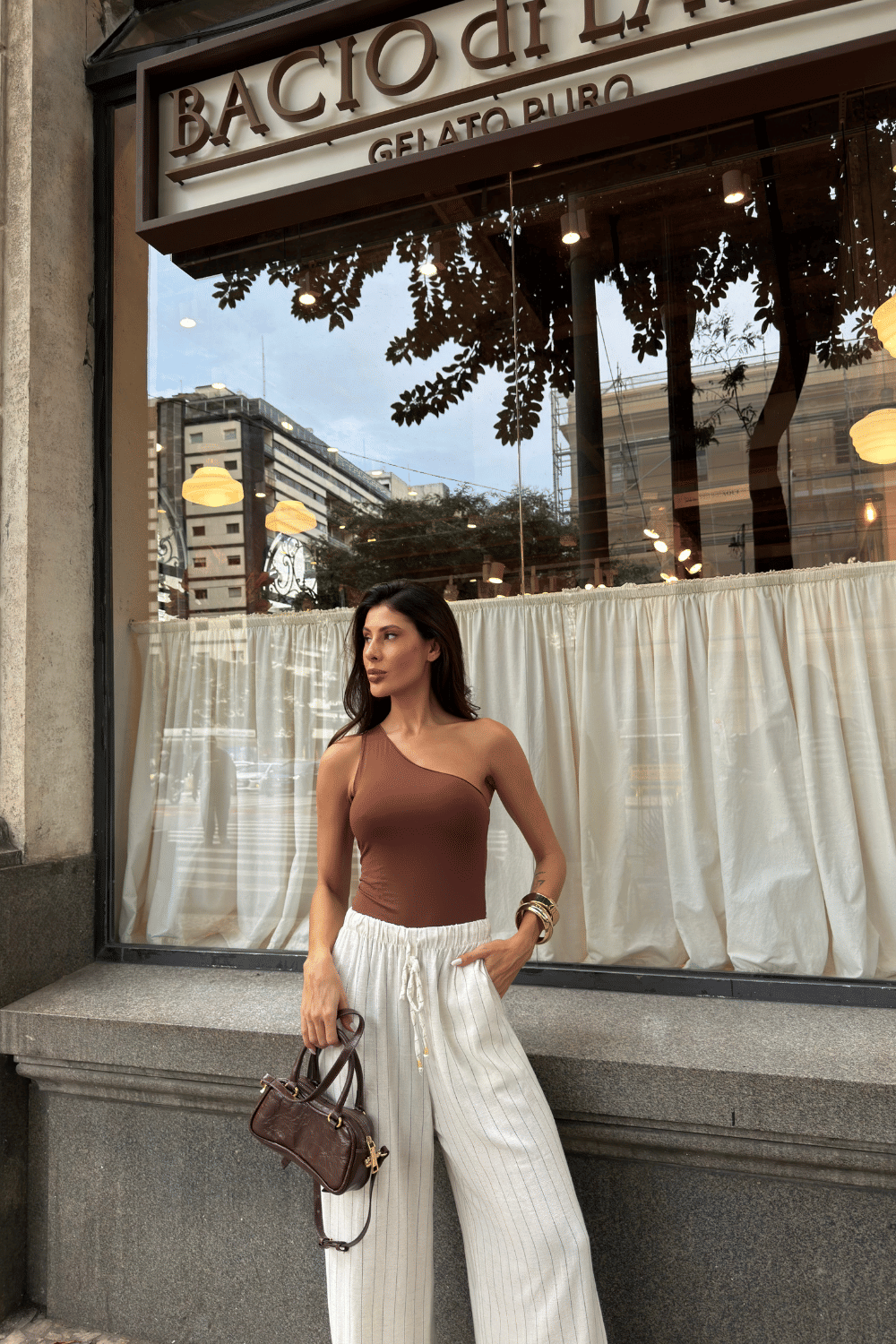 se você procura body marrom de ombro único, essa é a peça certa. o body gaia da dolce-me é confeccionado em poliamida 90% poliamida 10% elastano, com elástico no busto para melhor sustentação, estrutura toda dupla e fechamento por botões de pressão na parte inferior, o que garante segurança, conforto e ajuste perfeito ao corpo. o design de um ombro só traz efeito moderno e sofisticado, deixando o look ainda mais marcante.