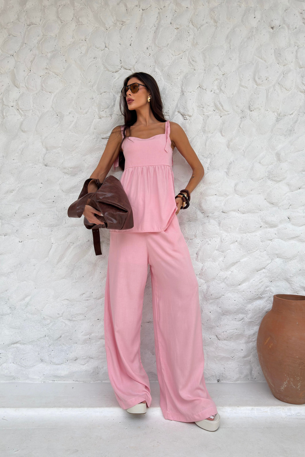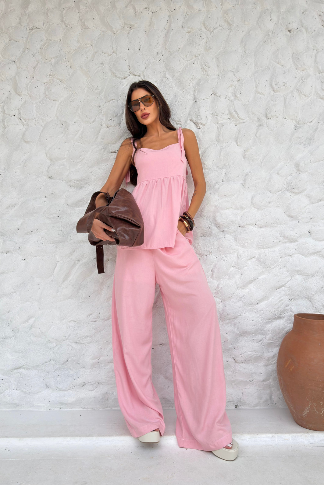 A modelagem é pantalona, com caimento amplo e solto, ideal para quem quer conforto sem abrir mão de um visual arrumado. Funciona tanto para dias quentes, viagens e compromissos casuais quanto para produções mais alinhadas, combinando facilmente com regatas, camisas leves, croppeds ou blusas de tecido fluido. É aquela peça que entra no guarda-roupa e realmente é usada, porque acompanha a rotina com praticidade.