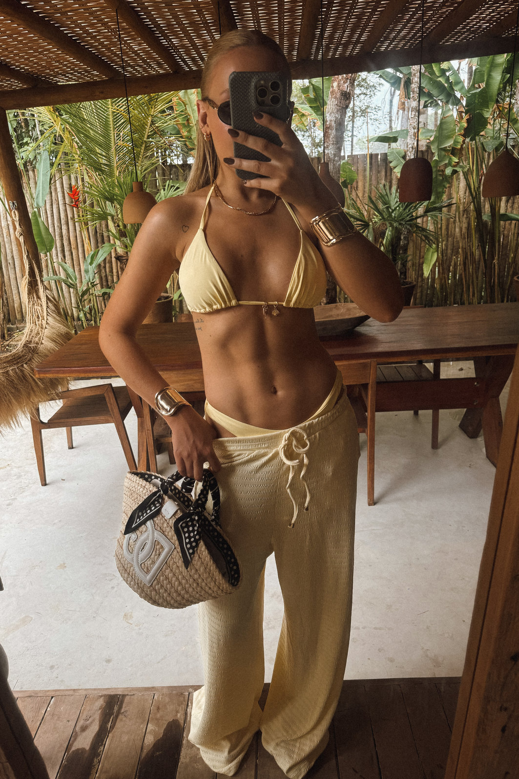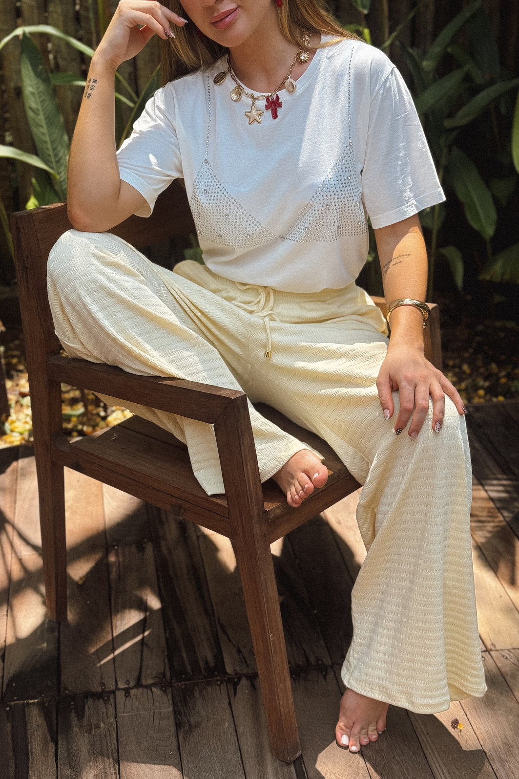 A calça pantalona Louise é perfeita para quem busca conforto aliado a muito estilo. Confeccionada em malha texturizada, oferece leveza e um caimento soltinho super charmoso. É uma das grandes apostas do verão, trazendo um ar tropical à peça. Conta ainda com elástico na cintura, garantindo praticidade e ajuste confortável, conforto no uso, além de bolsos laterais funcionais, indispensáveis nesse modelo de calça. Essa calça é ideal para produções casuais com t-shirts ou looks mais estilosos com tops e camisas abertas.