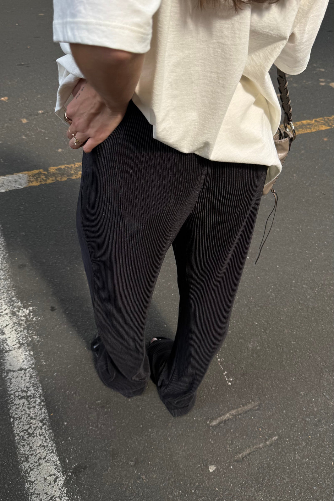 - Detalhes: pernas largas com caimento elegante ao caminhar, cós com elástico que se adapta suavemente à cintura, sem bolsos e sem forro para manter a leveza e o efeito contínuo do plissado