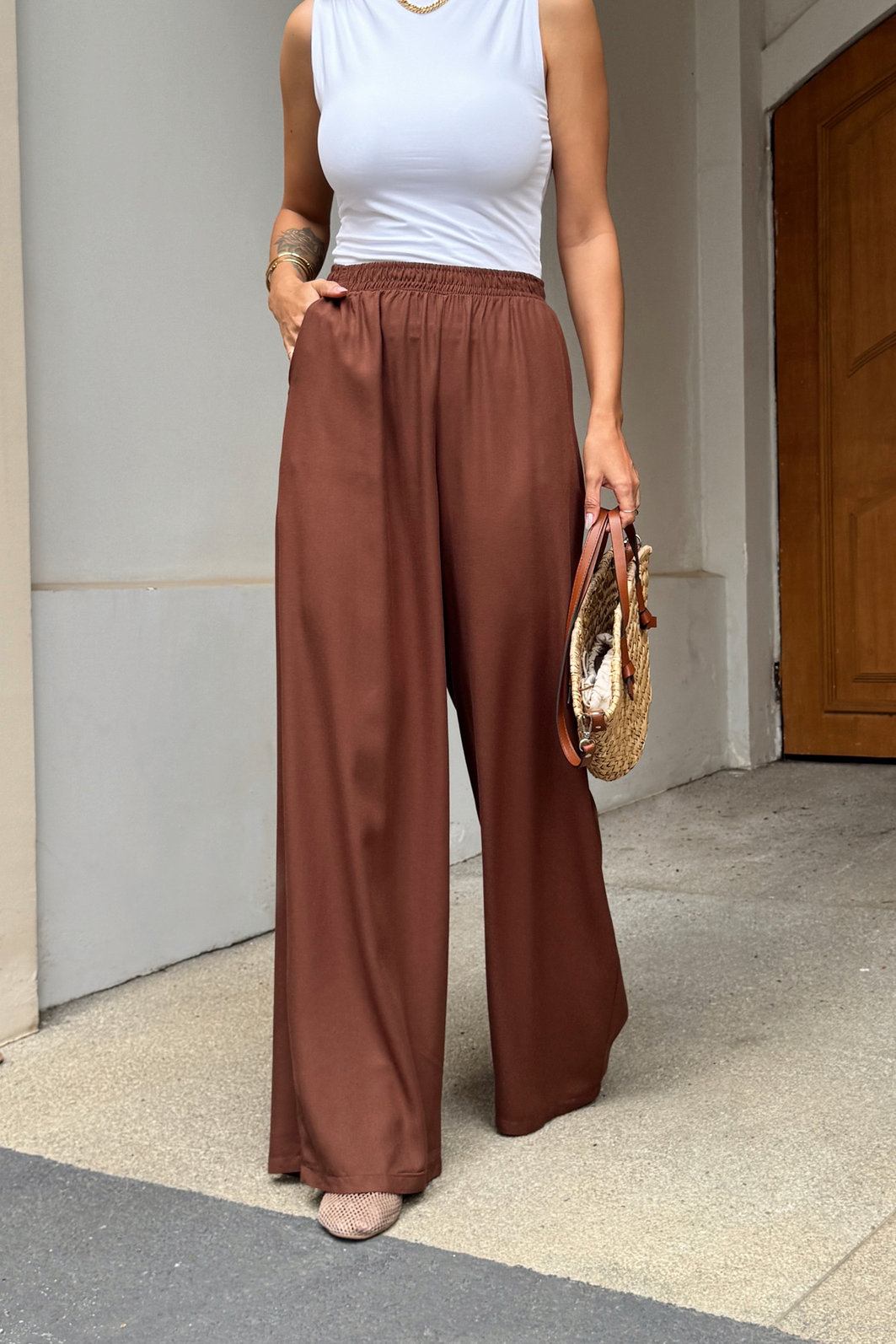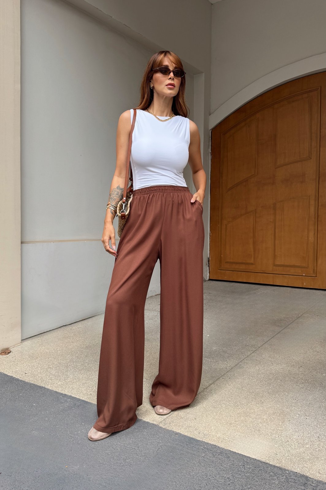 | Detalhes | Calça bem solta ao corpo, tecido de viscose, bolsos funcionais nas laterais, elástico na cintura para um ajuste prático e confortável e acabamento em bainha. |