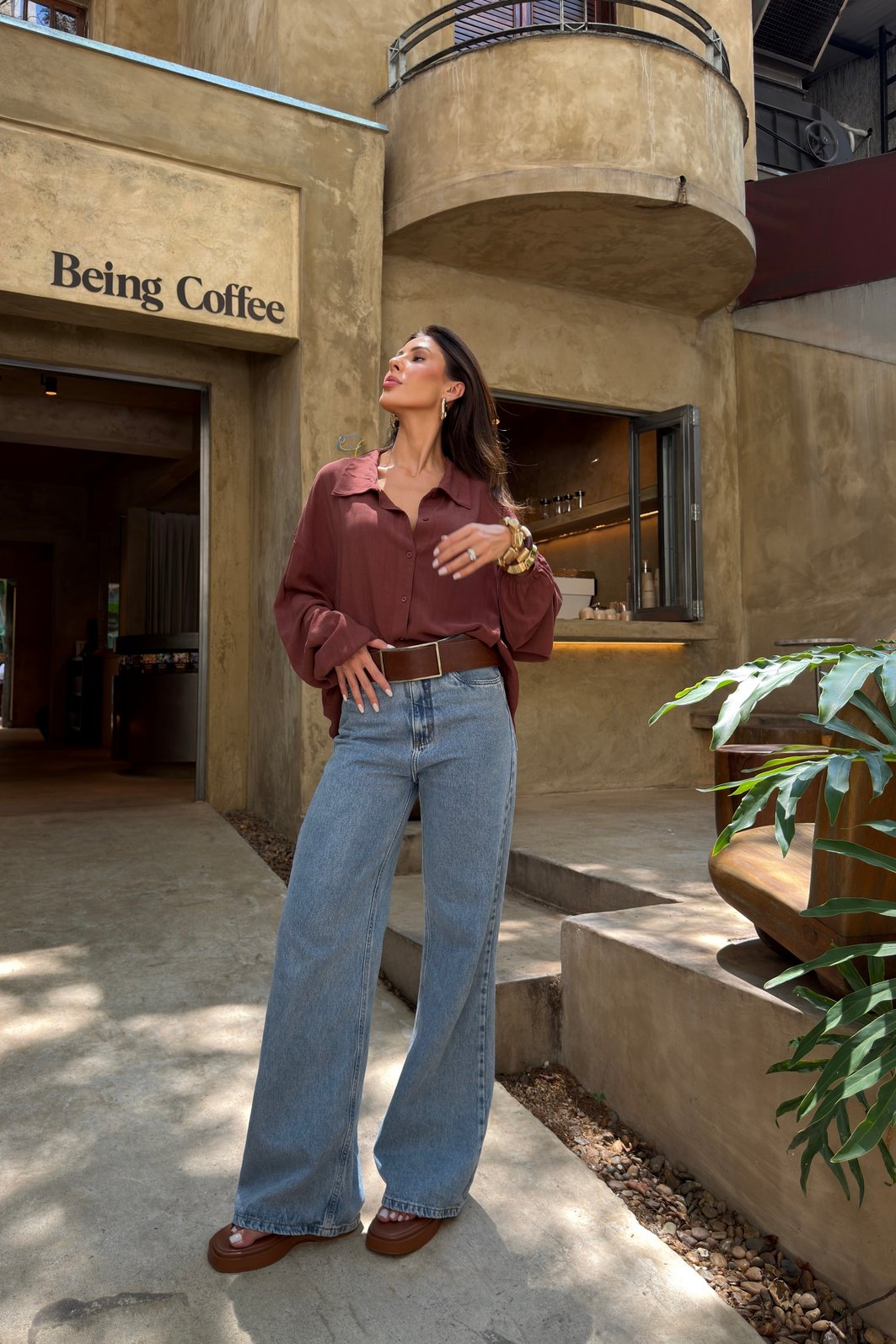 A modelagem é solta, com caimento fluido, ideal para quem quer conforto sem perder a elegância. Funciona tanto para looks de trabalho mais descontraídos quanto para produções casuais ou alinhadas, combinando facilmente com calças de alfaiataria, jeans, pantalonas ou saias. É aquela camisa versátil que resolve o look e acompanha a rotina real.