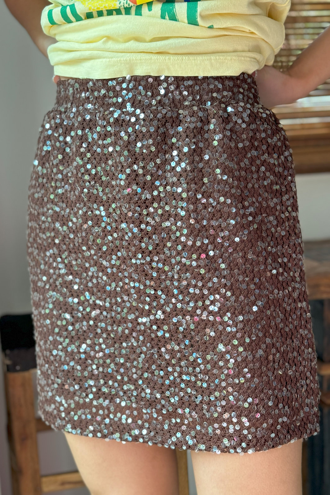 | Detalhes | Saia em malha com textura de tricot e lantejoulas, cós com elástico e acabamento em bainha. |