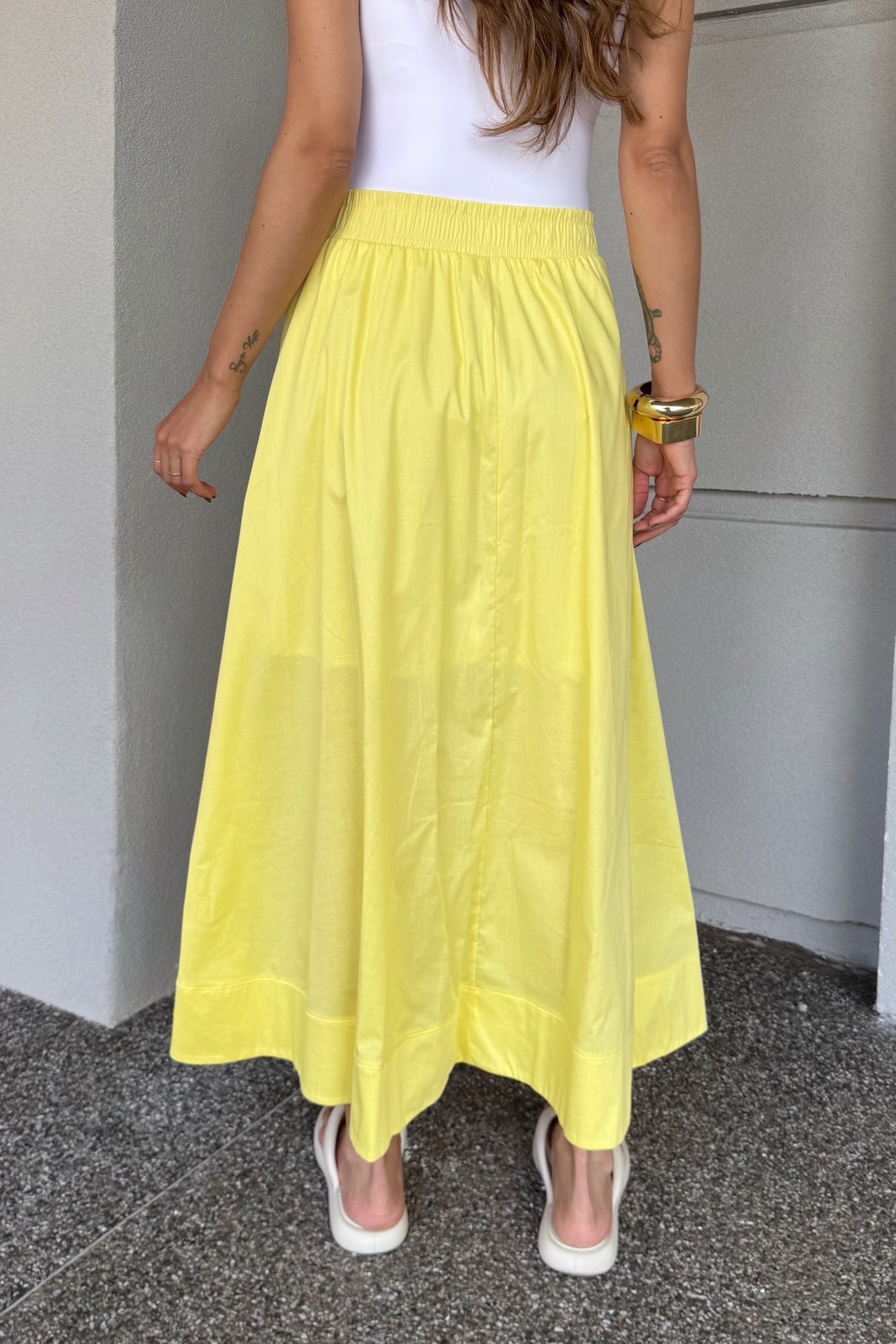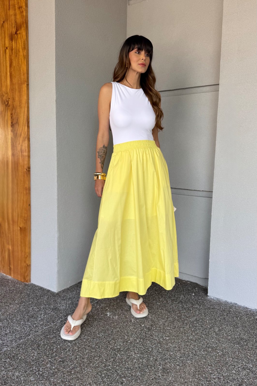 DetalhesSaia de comprimento midi com forro, elástico na cintura, bolsos funcionais e acabamento de barra dupla com pesponto interno.