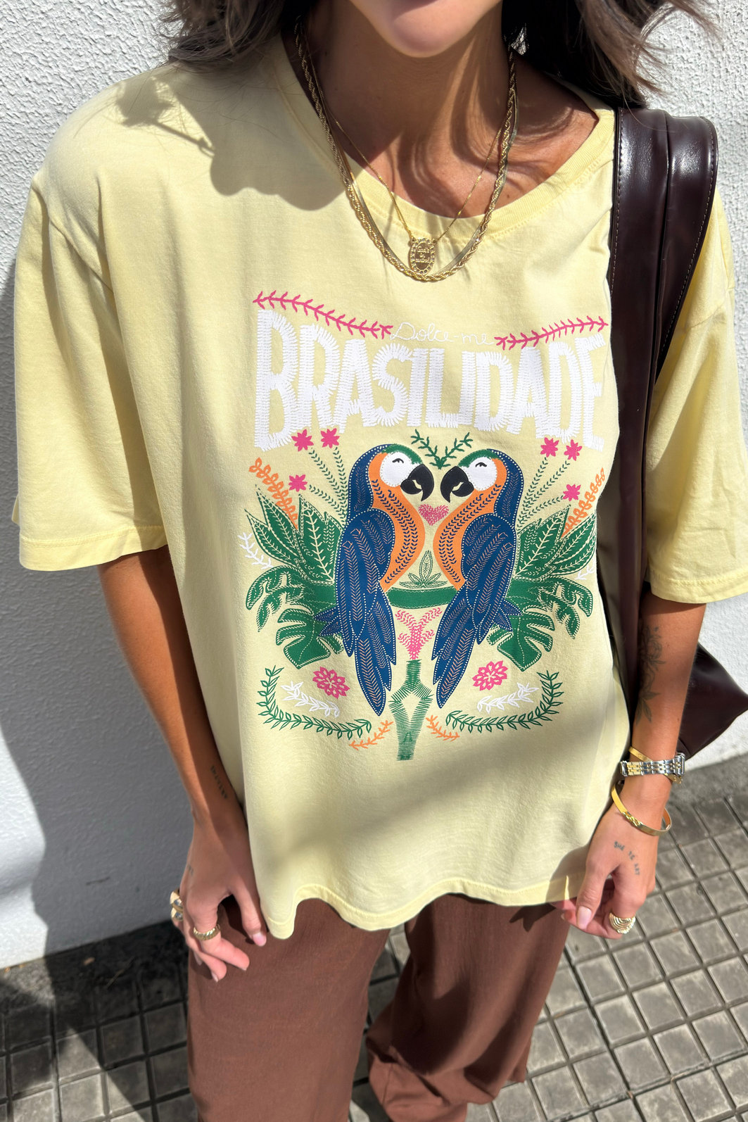 A t-shirt estonada brasilidade amarelo manteiga da dolce-me é confeccionada em malha pt pré-encolhida 100% algodão, com estampa localizada frontal em silk screen, o que garante mais durabilidade e definição ao desenho. O acabamento estonado traz um visual moderno e levemente vintage, deixando a peça ainda mais especial. a modelagem é clássica, com caimento confortável, ideal para quem quer praticidade e estilo no dia a dia. Funciona tanto para produções casuais quanto para composições mais elaboradas, combinando facilmente com jeans, alfaiataria ou shorts. É aquela peça que entra no guarda-roupa e realmente é usada.