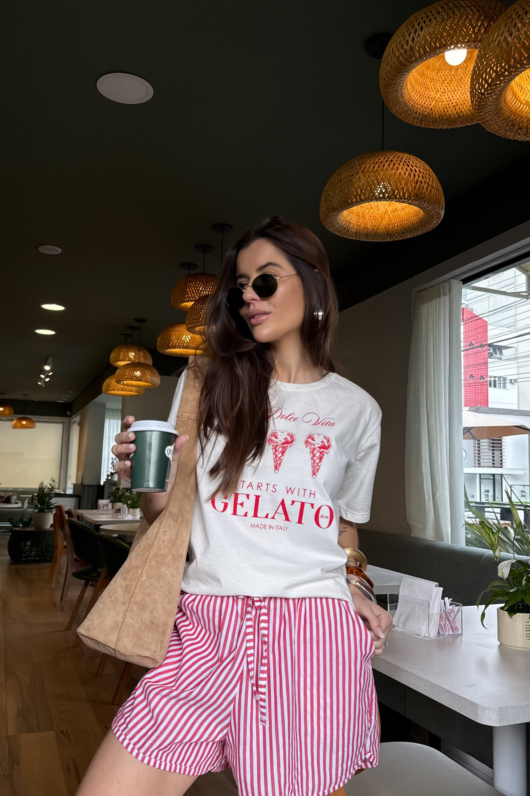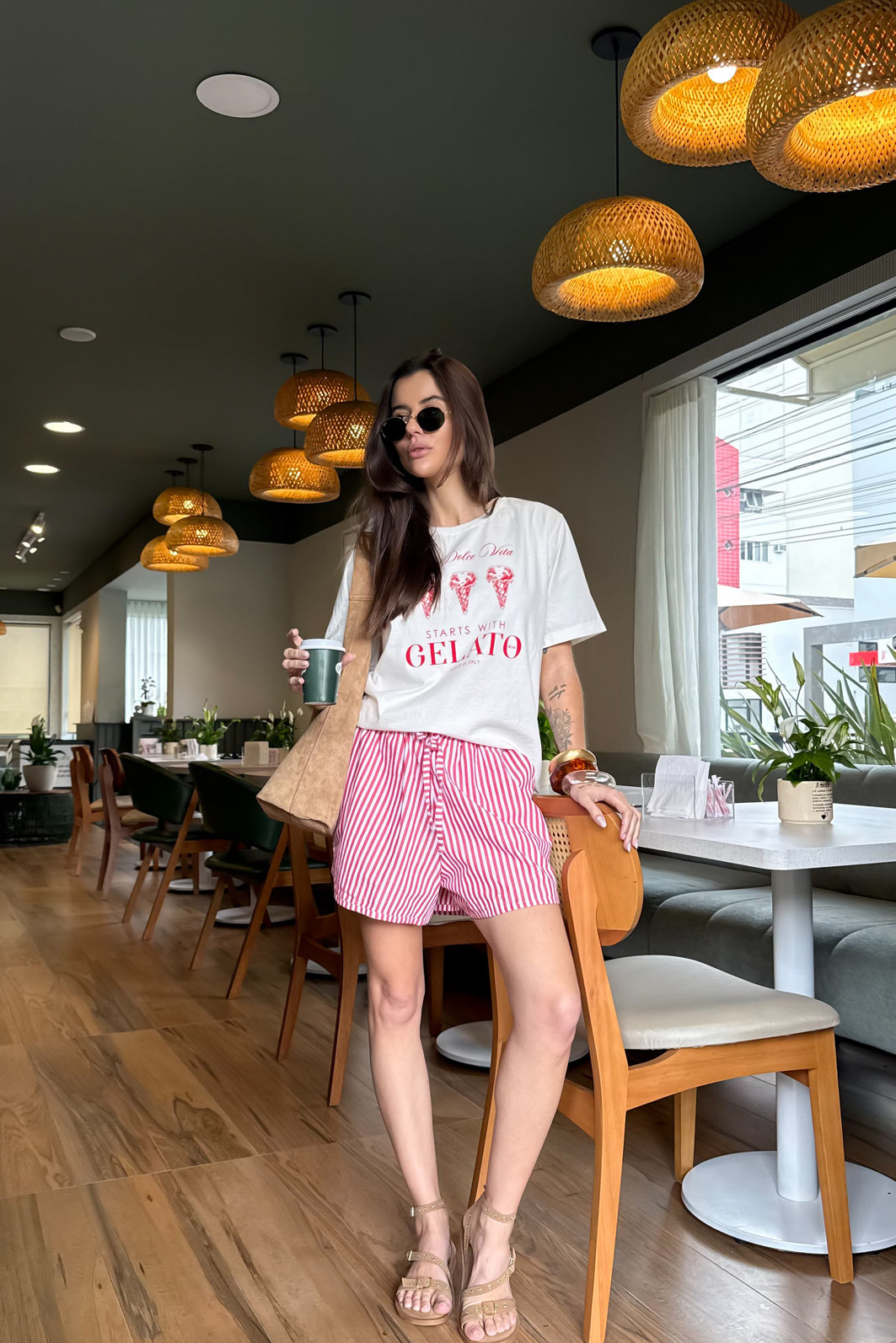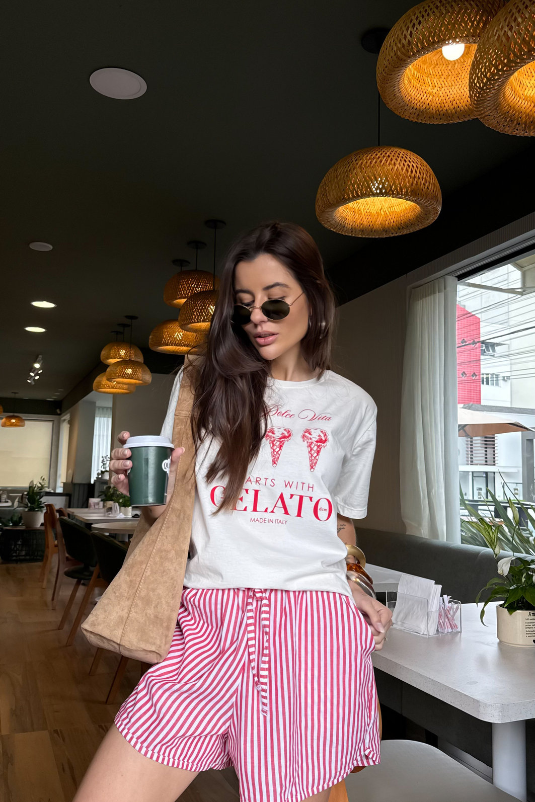 Doce, leve e cheia de estilo! A t-shirt estonada Gelato é aquela peça que une conforto, atitude e um visual cheio de personalidade. Confeccionada em meia malha 100% algodão com lavagem estonada, ela tem toque macio e caimento soltinho que faz toda a diferença. A estampa em tom de vermelho sobrepondo o off white traz um toque vibrante e divertido, perfeita pra quem ama um mood leve e com personalidade. Combine com jeans, shorts ou saias para um look casual e cheio de charme, ideal para curtir o dia com estilo e uma pitada de doçura.