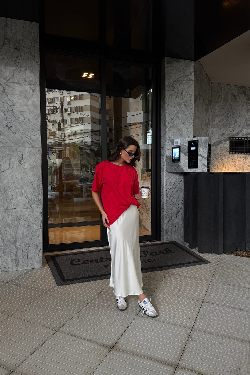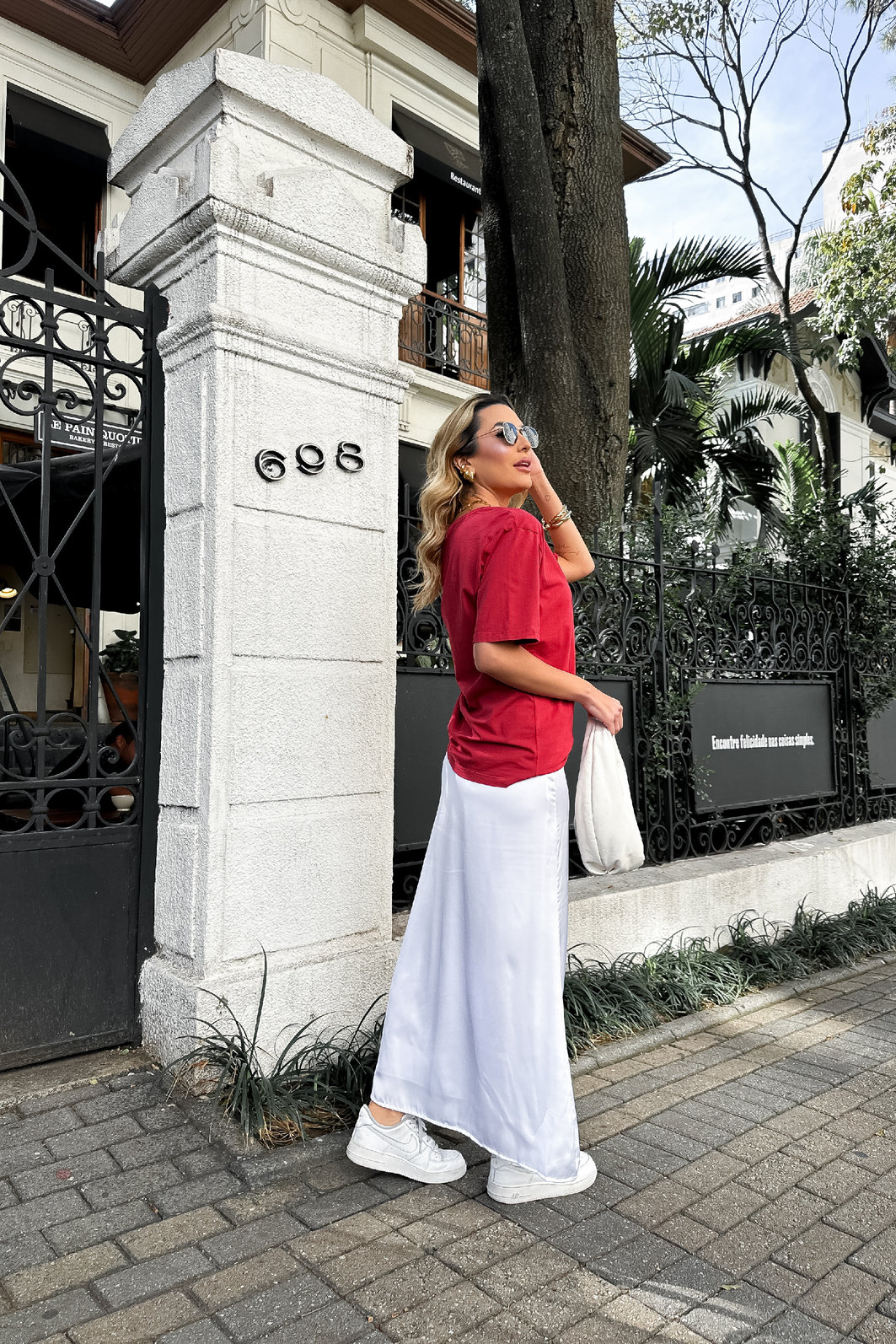 - Modelagem: mais soltinha no corpo, shape reto, ombro levemente deslocado e manga curta