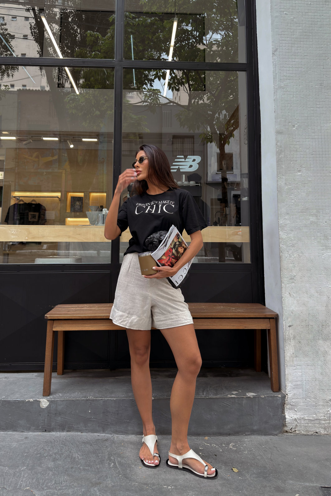 A t-shirt estonadaMake It Chic traz uma proposta atual e versátil, com visual clean que valoriza a malha preta e a mensagem da estampa. Uma peça essencial, pensada para compor produções práticas com um toque de estilo. Confeccionada em malha confortável, possui caimento fácil e toque macio, ideal para o uso diário. A base preta garante neutralidade e sofisticação, facilitando diferentes combinações. Use com jeans, alfaiataria ou saias para looks que transitam do casual ao urbano com facilidade. Uma t-shirt indispensável para quem busca conforto, versatilidade e elegância no dia a dia.