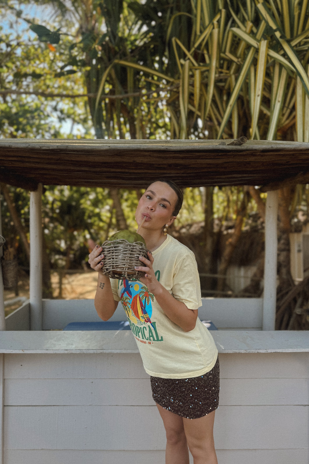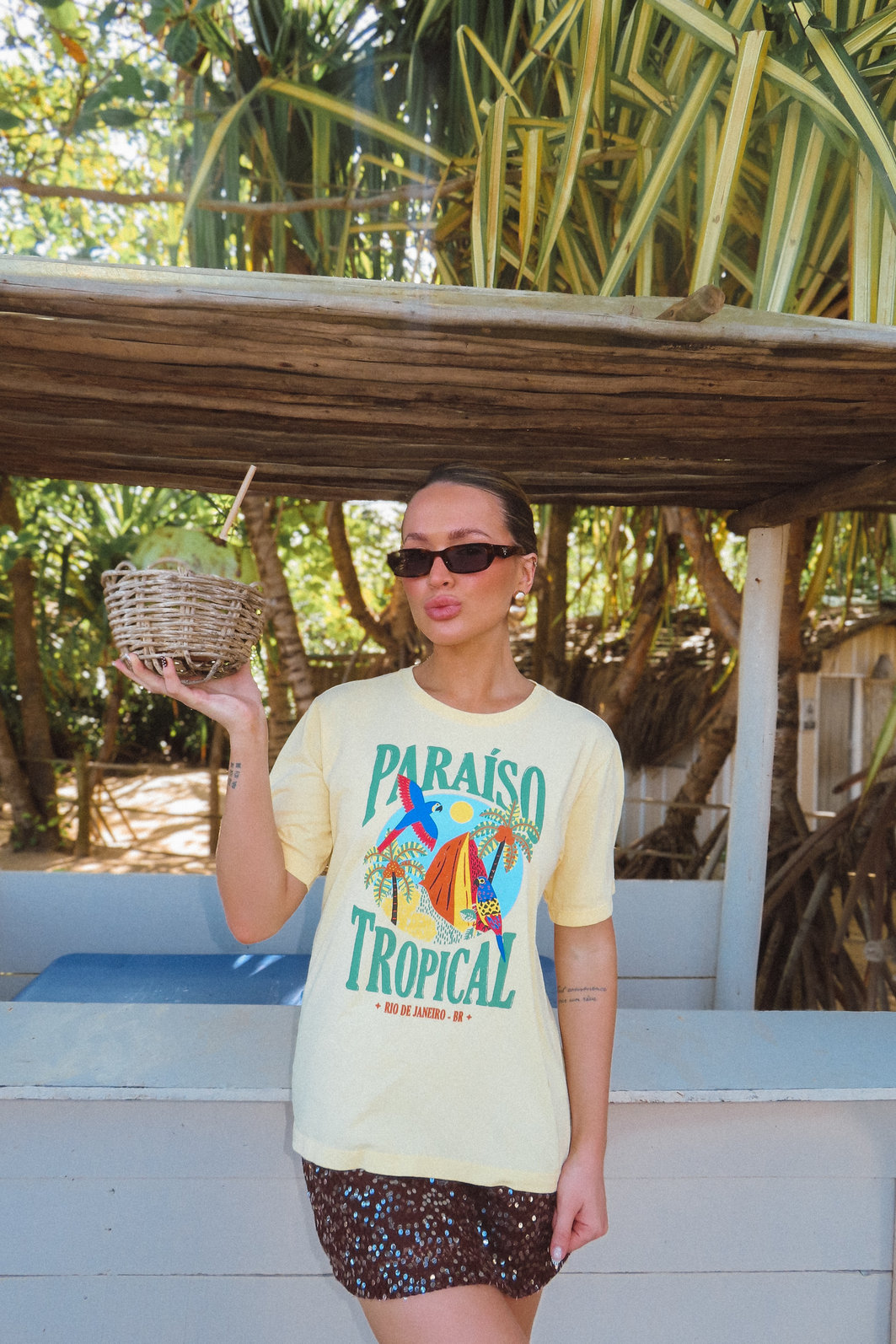 Com vibe leve e cheia de energia, a t-shirt estonada Paraíso Tropical é a escolha ideal para quem ama o clima do verão o ano todo. Confeccionada em meia malha 100% algodão, ela tem toque macio, caimento leve e muito conforto. A estampa de araras em cores vibrantes sobre o fundo amarelo traz um ar tropical e muito estiloso!! Perfeita pra combinar com jeans, shorts ou saias e curtir os dias de sol com leveza.