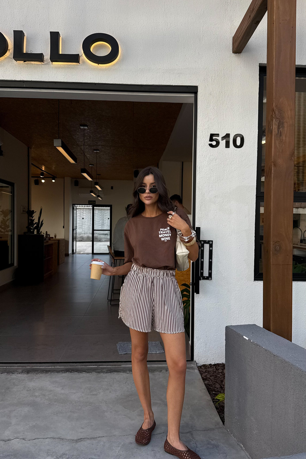 A t-shirt perfeita pra quem sabe o que quer da vida: paz, viagens, grana e um bom vinho! Em um tom marrom, ela tem modelagem básica com um toque fun, estampa frontal minimalista e aquela energia leve que combina com dias despreocupados. Ideal pra jogar com jeans, shortinho ou até por cima do biquíni — afinal, estilo bom é aquele que acompanha seu mood.