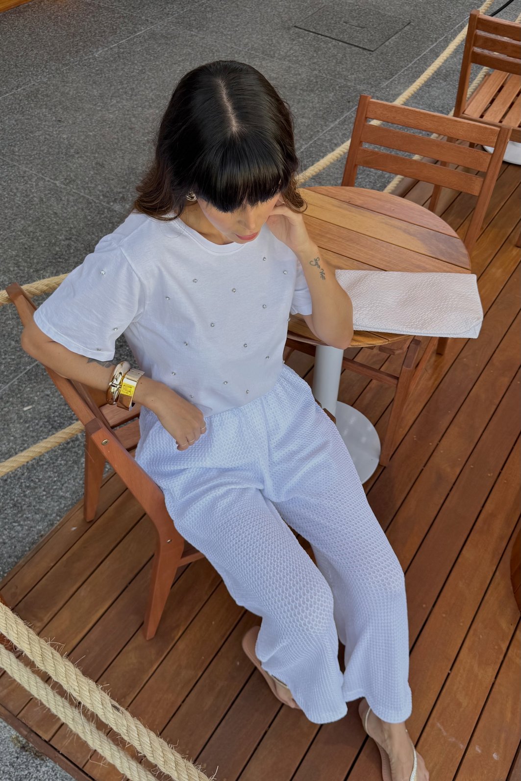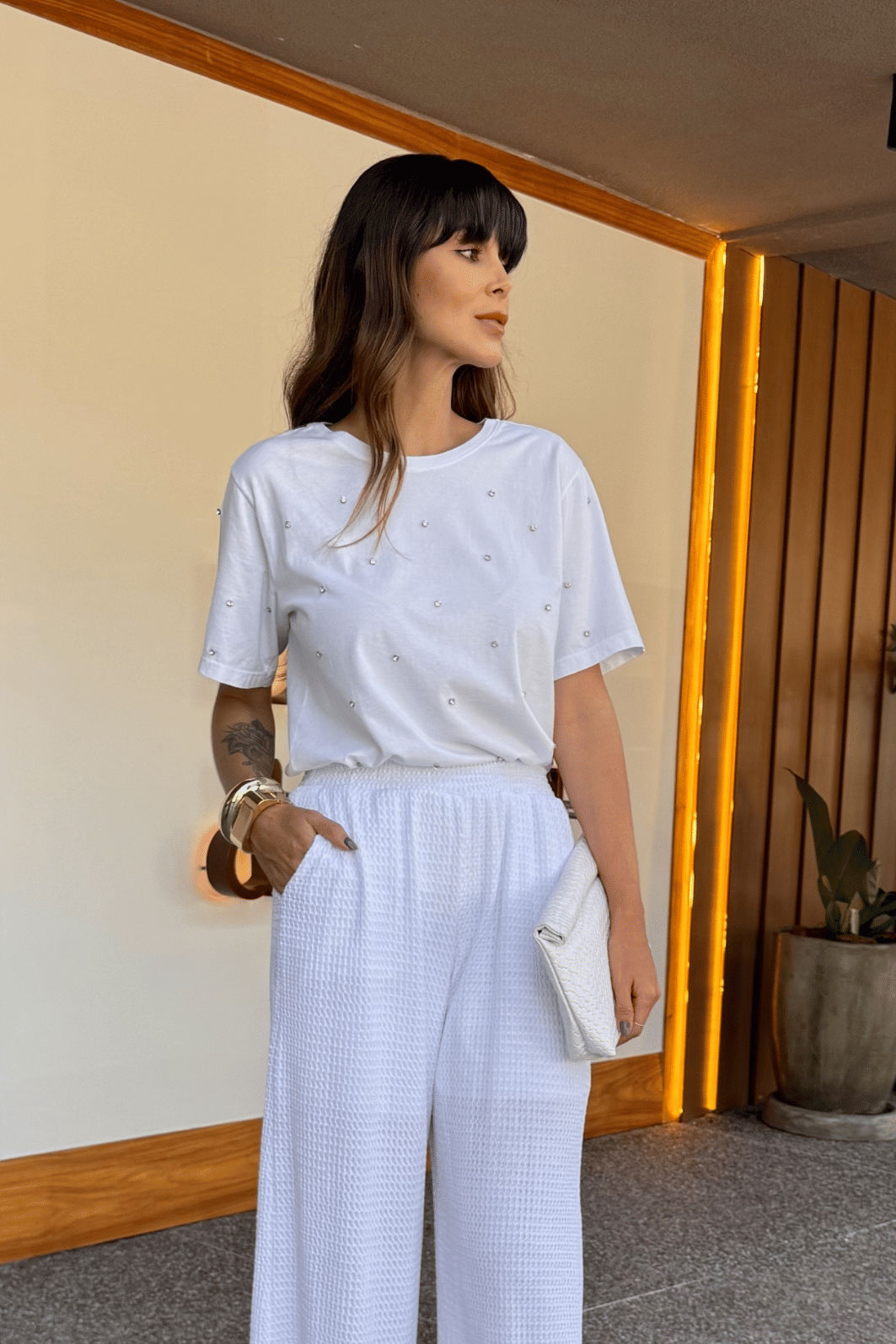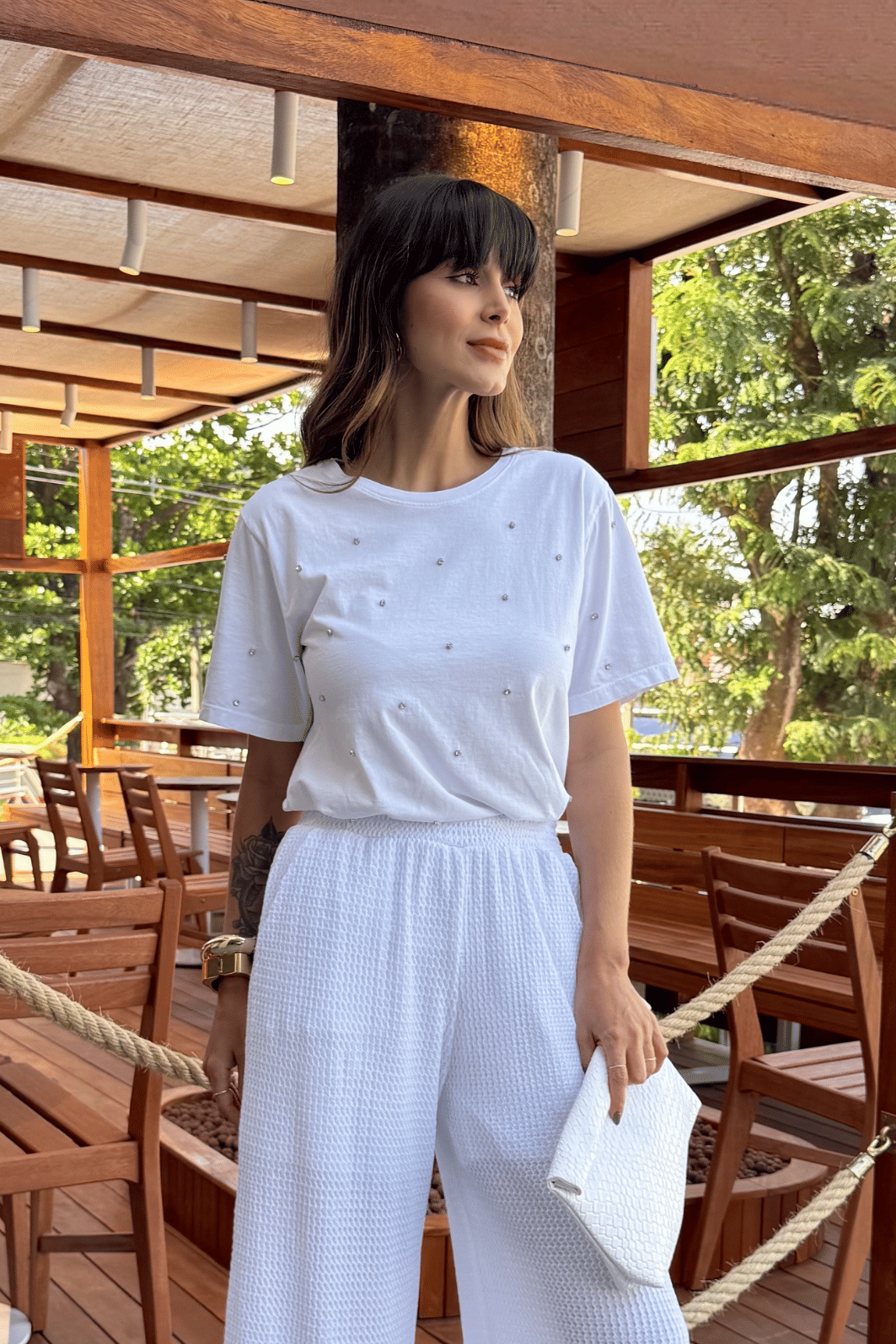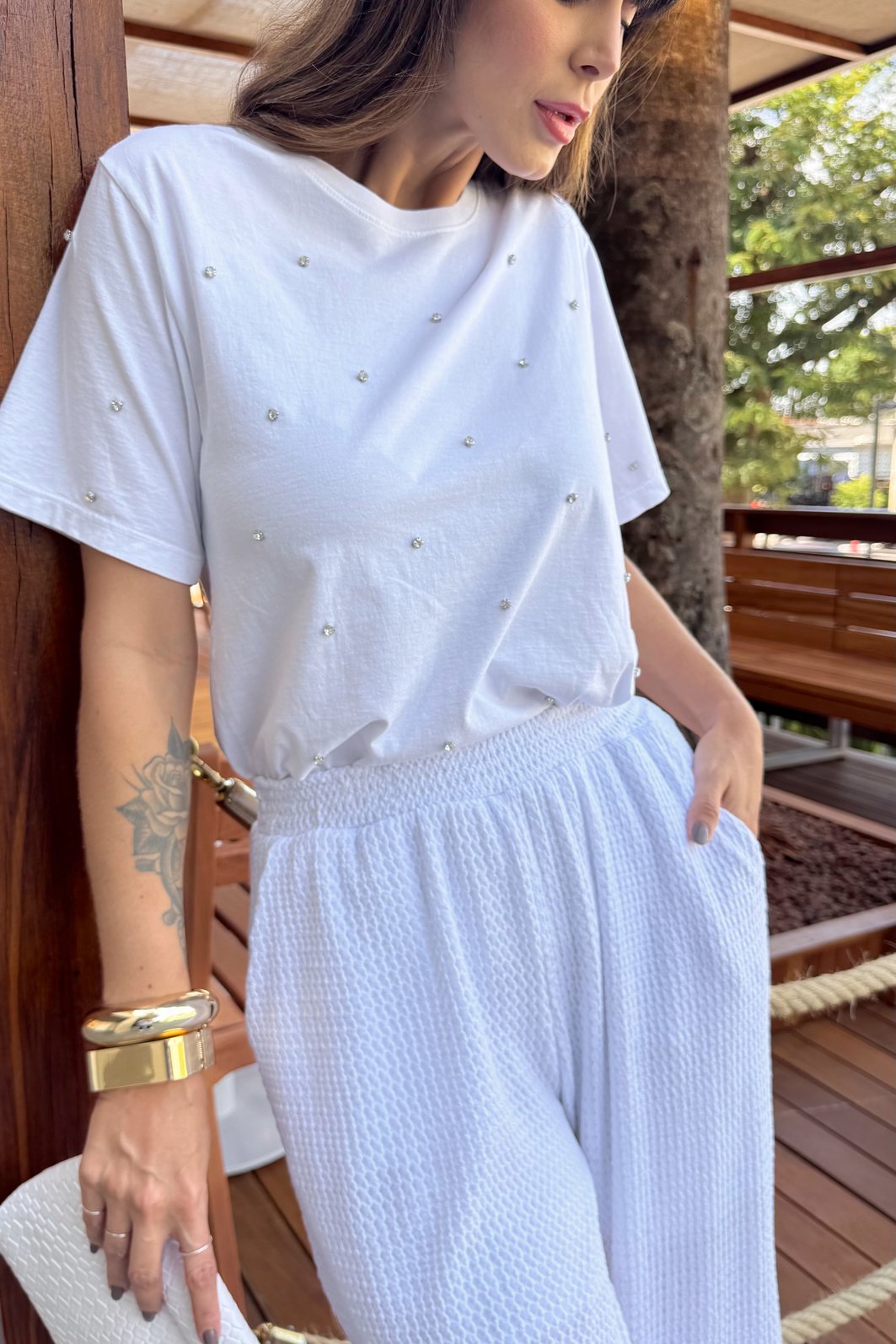 Essa t-shirt é aquele toque doce e glam que o look do dia pede: em tom branco super delicado, ela ganha um charme especial com aplicações de pedraria espalhadas, criando pontos de luz sutis e sofisticados. Com modelagem tradicional e confeccionada em malha 100% algodão, garante conforto absoluto sem abrir mão do estilo. Perfeita para combinar com jeans, saias ou até alfaiataria, é a peça que transforma o básico em chic num piscar de olhos.