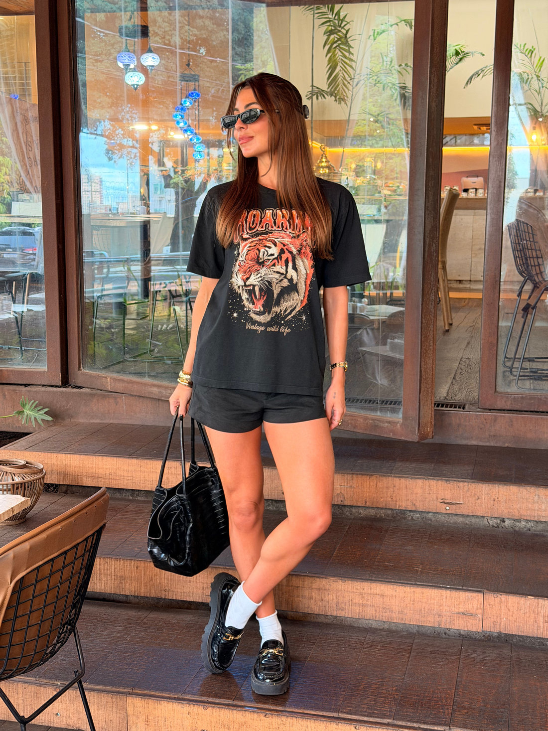 se você procura t-shirt preta estampada, essa é a peça certa. a t-shirt estonada roaring tiger com aplique preta da dolce-me é confeccionada em malha pt pré-encolhida 100% algodão, com estampa localizada frontal em silk screen e aplique, o que garante toque macio, respirabilidade e efeito visual marcante. o detalhe em aplique traz textura e profundidade para a arte, deixando a peça ainda mais impactante.