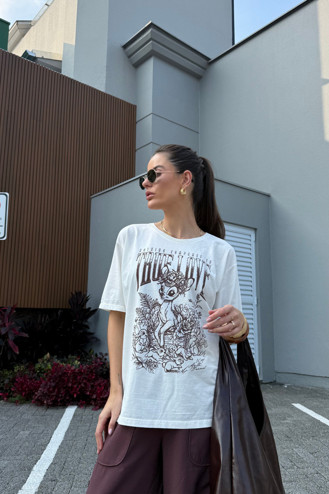 A t-shirt estonada true love bambi off white da dolce-me é confeccionada em malha pt pré-encolhida 100% algodão, com estampa localizada frontal em silk screen, o que garante mais durabilidade e definição ao desenho. O acabamento estonado traz um visual moderno e levemente vintage, deixando a peça ainda mais especial. a modelagem é clássica, com caimento confortável, ideal para quem quer praticidade e estilo no dia a dia. Funciona tanto para produções casuais quanto para composições mais elaboradas, combinando facilmente com jeans, alfaiataria ou shorts. É aquela peça que entra no guarda-roupa e realmente é usada.