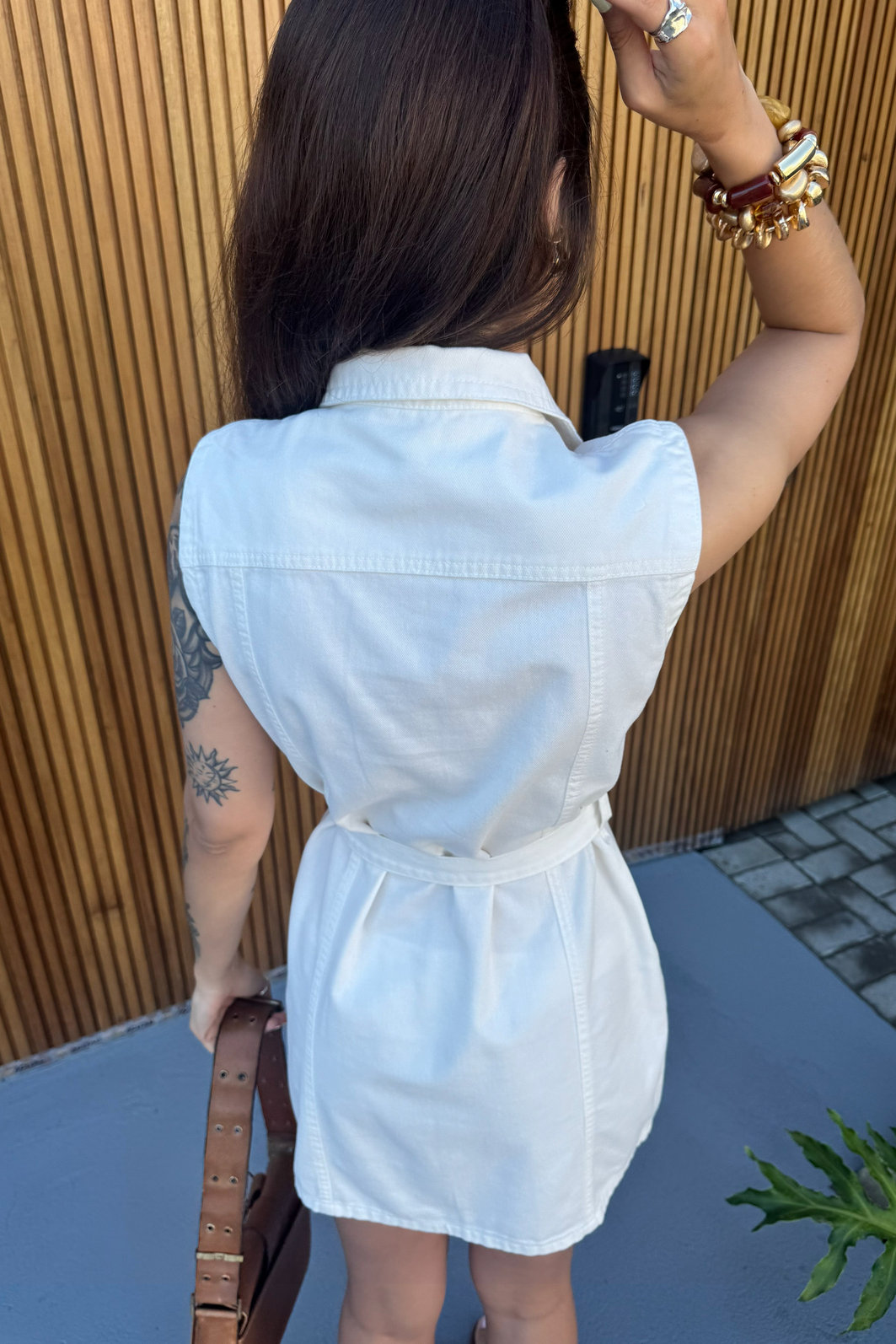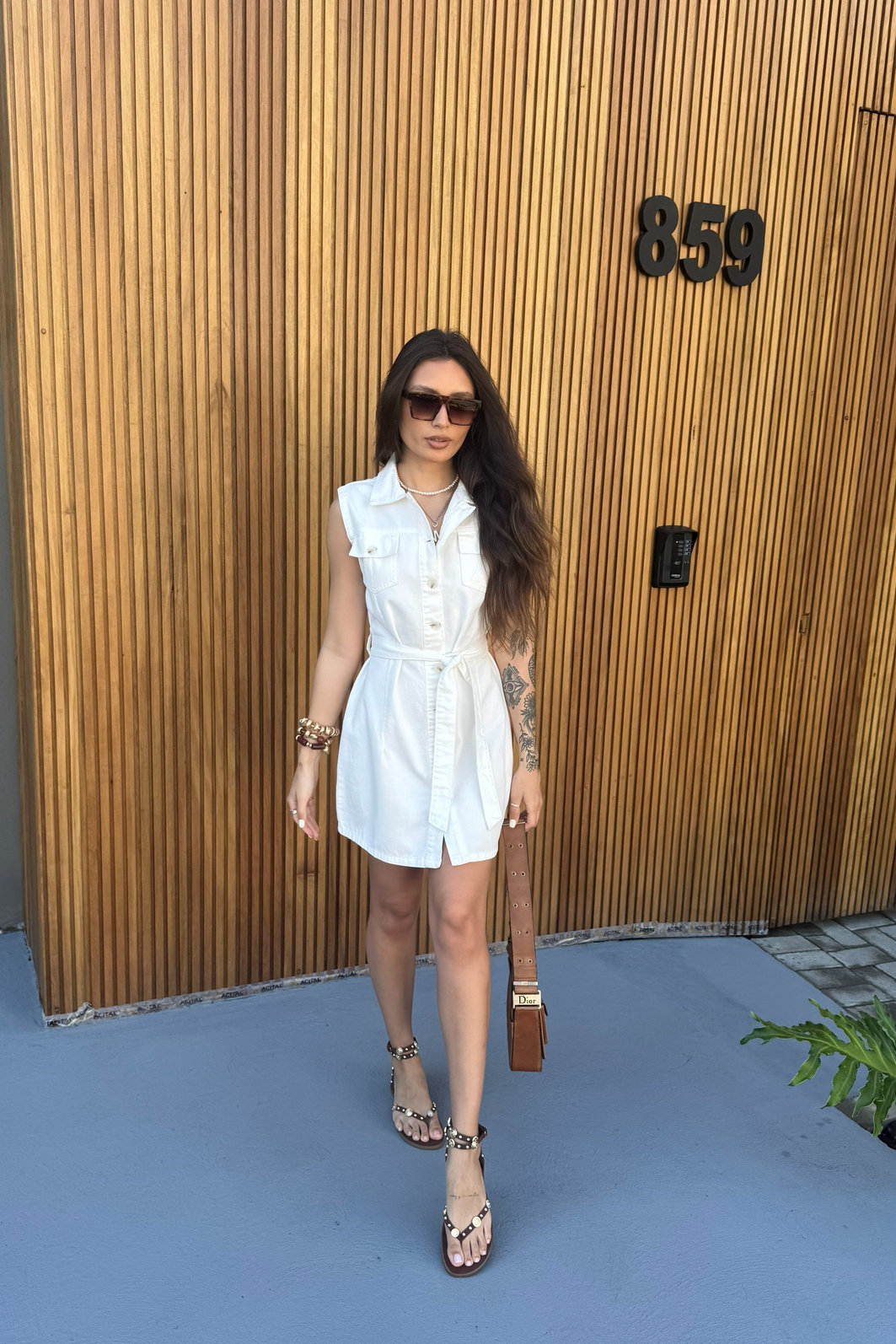 Detalhes | Vestido curto em 100% sarja de algodão sem elastano, na cor off white, modelagem reta, sem mangas, gola tradicional, fechamento frontal por botões, bolsos frontais, acabamento pespontado e cinto do mesmo tecido para ajuste na cintura |
