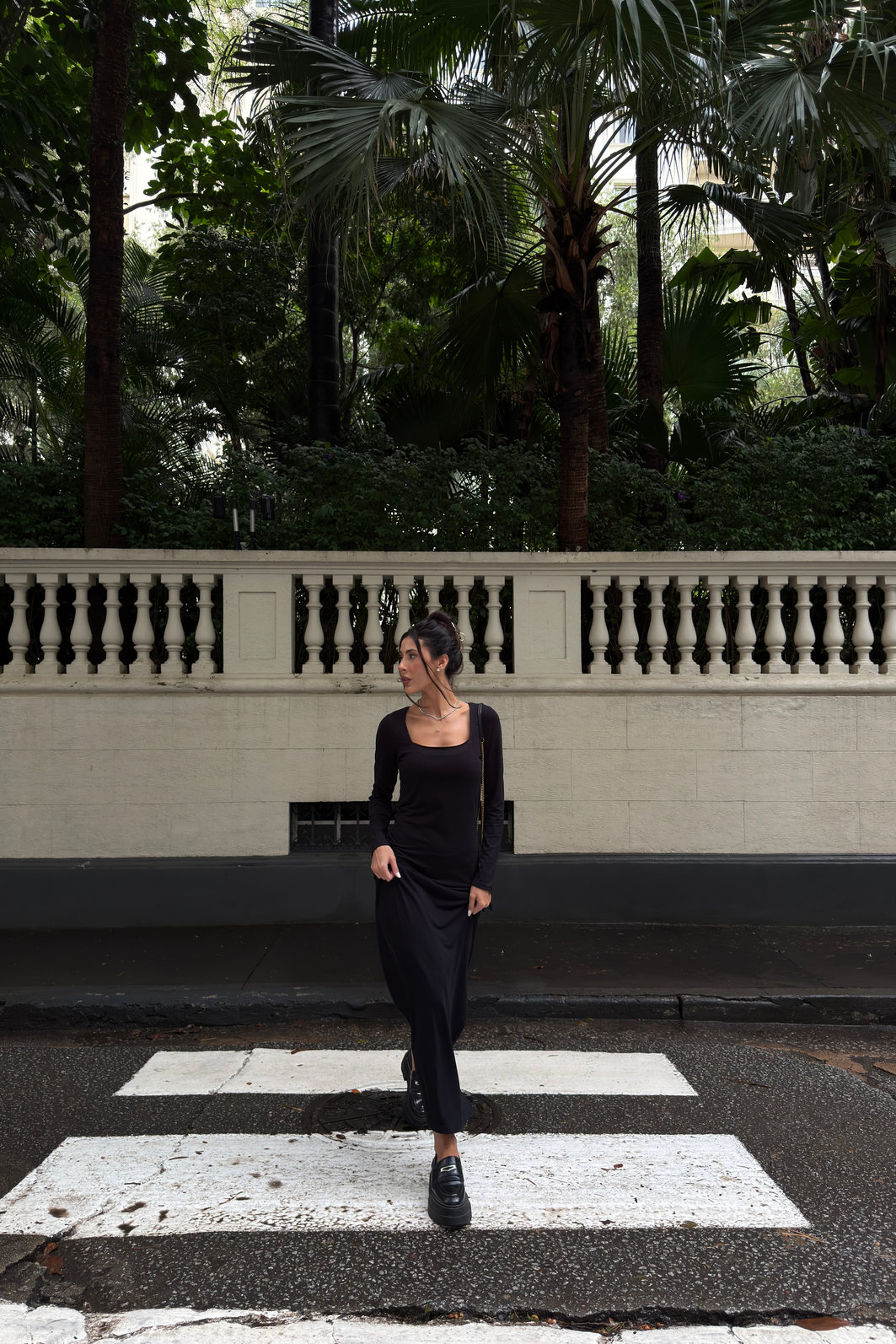 - Detalhes: decote quadrado, mangas longas, fenda, caimento que acompanha suavemente as linhas do corpo até a barra para silhueta alongada e minimalista