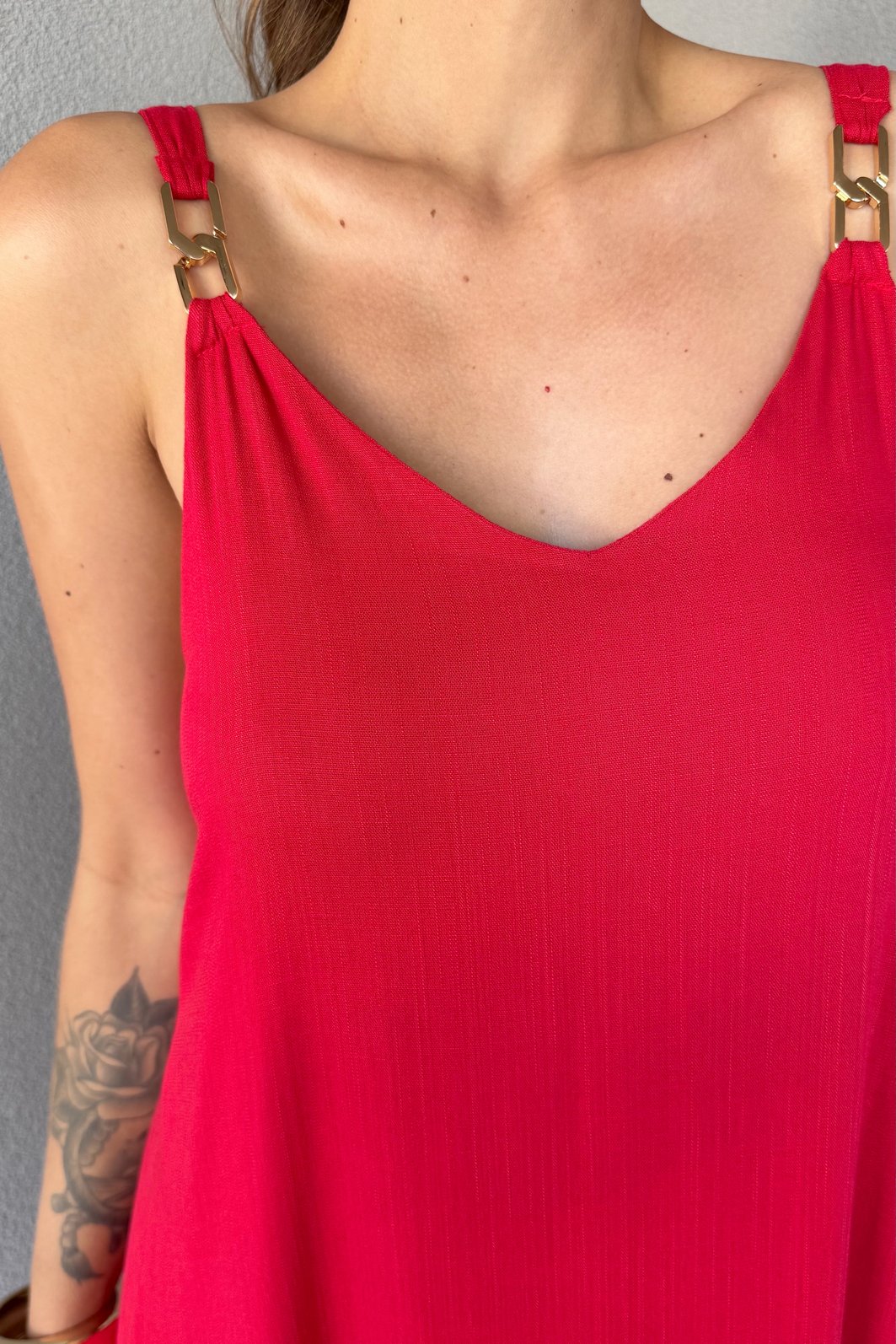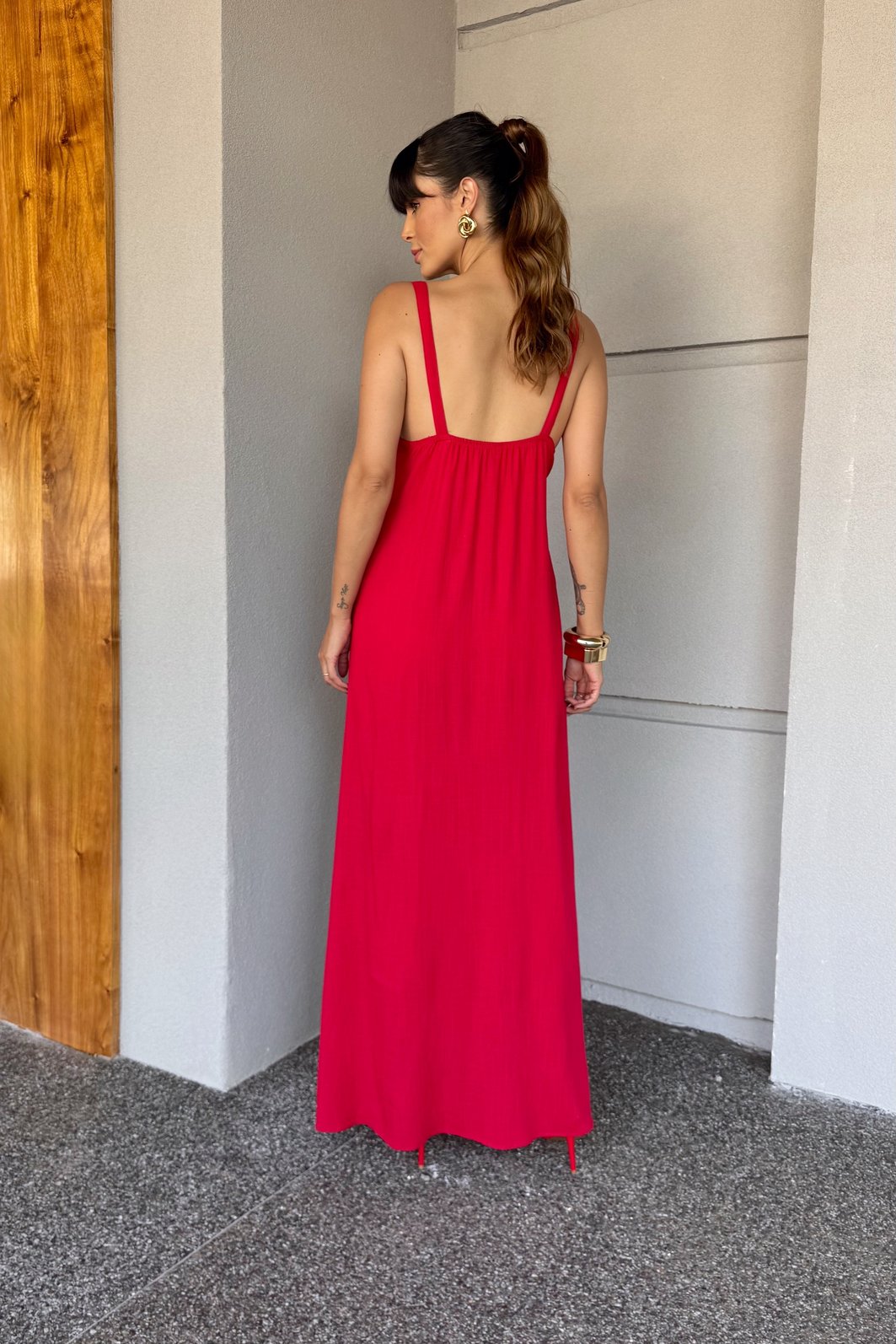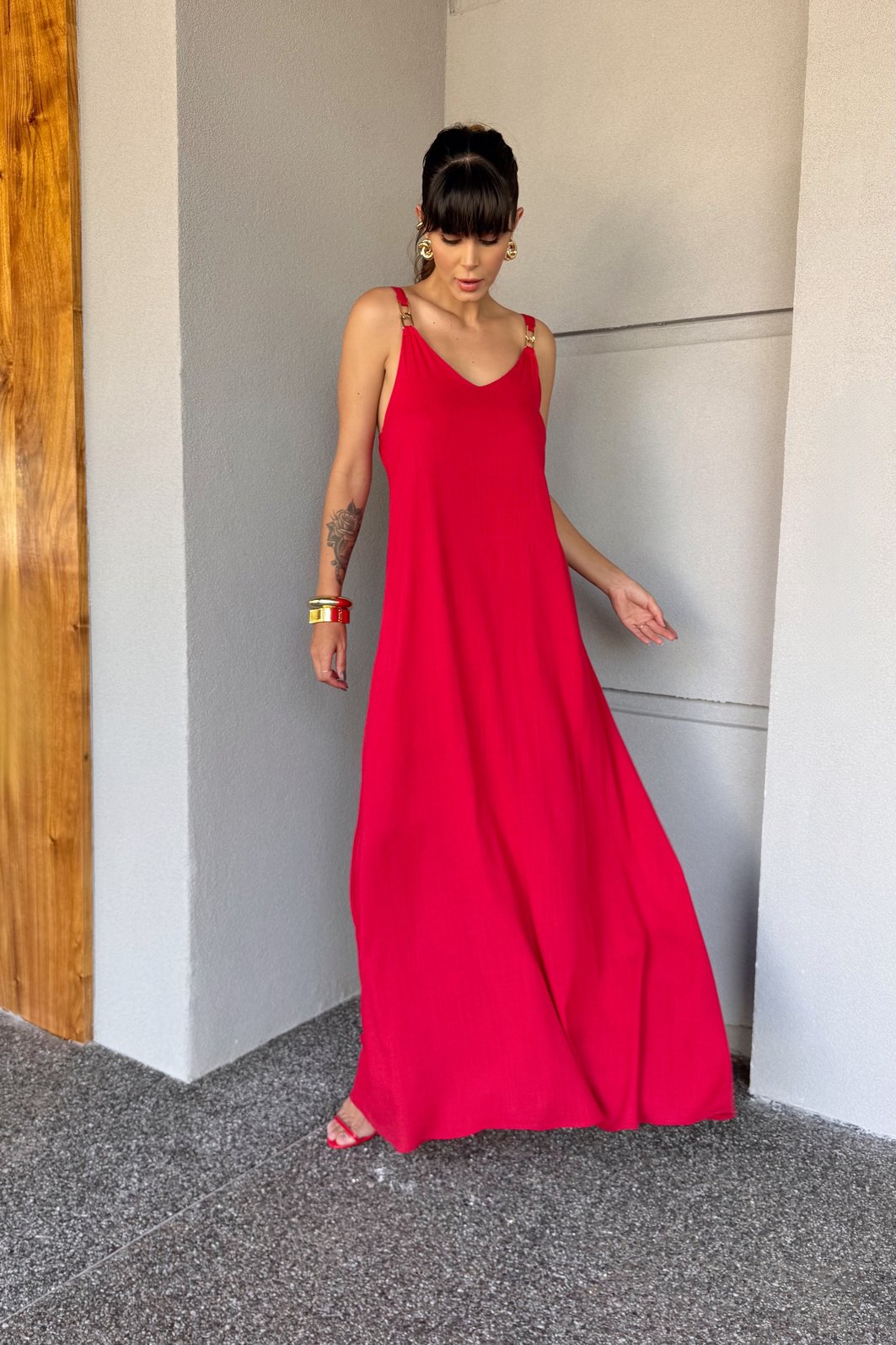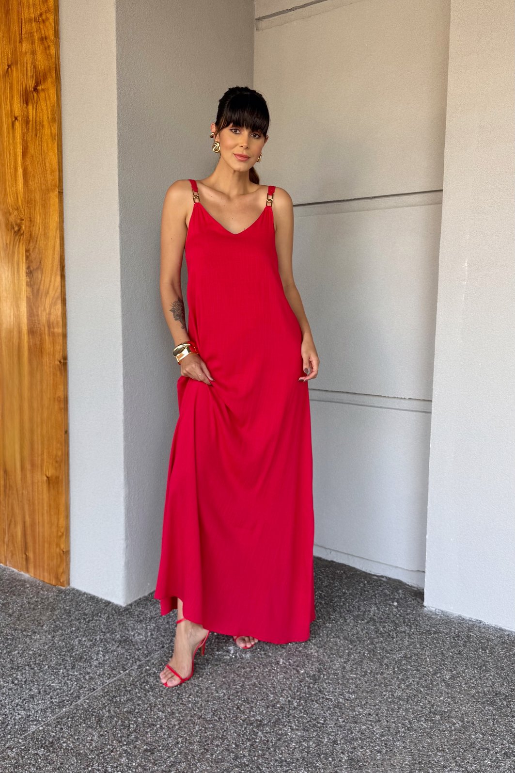 | Detalhes | Vestido com comprimento longo em viscose com textura que remete ao linho, tecido mais encorpado e que não amassa, decote com forro meio busto, alças com detalhes em metal, bolsos laterais funcionais e acabamento em bainha. |