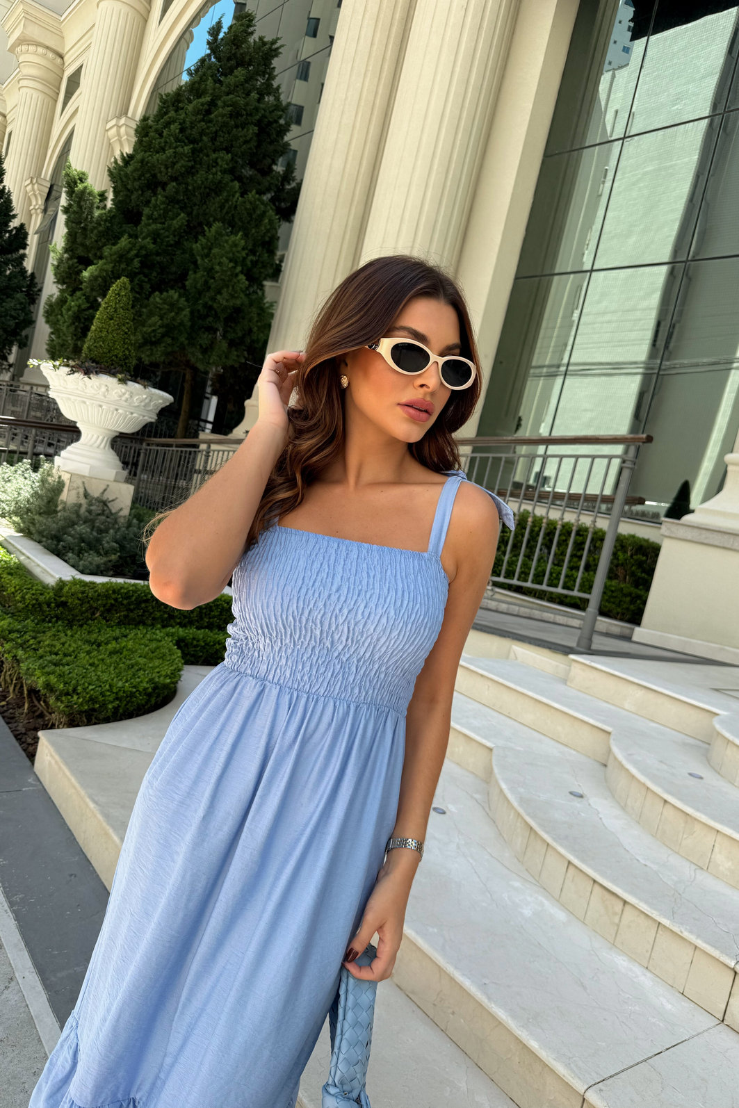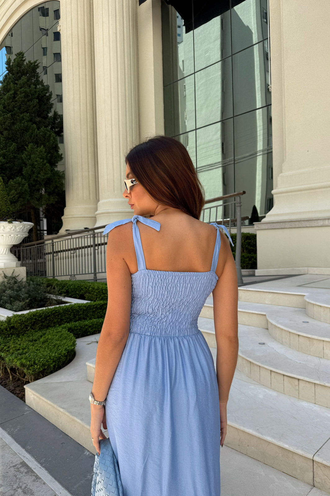 | Detalhes | Vestido com comprimento midi em viscose com textura que remete ao linho natural, tecido mais encorpado e que não amassa, sem forro pois não fica transparente, modelagem evasê, alças de amarrar, decote reto, parte superior com lastex, recorte na barra com leve franzido e acabamento em bainha |