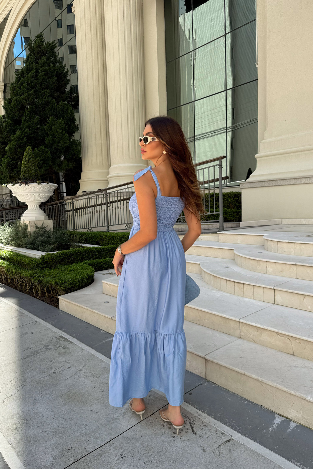 Confeccionado em tecido leve de viscose com detalhes que lembram as tramas do linho natural, toque fresco ao corpo e caimento fluido, o vestido Paty traz um visual delicado e feminino. Possui busto em lastex, que se ajusta perfeitamente ao corpo, alças médias para amarrar e modelagem evasê, com recortes e leve franzido na barra para criar movimento e um caimento elegante.