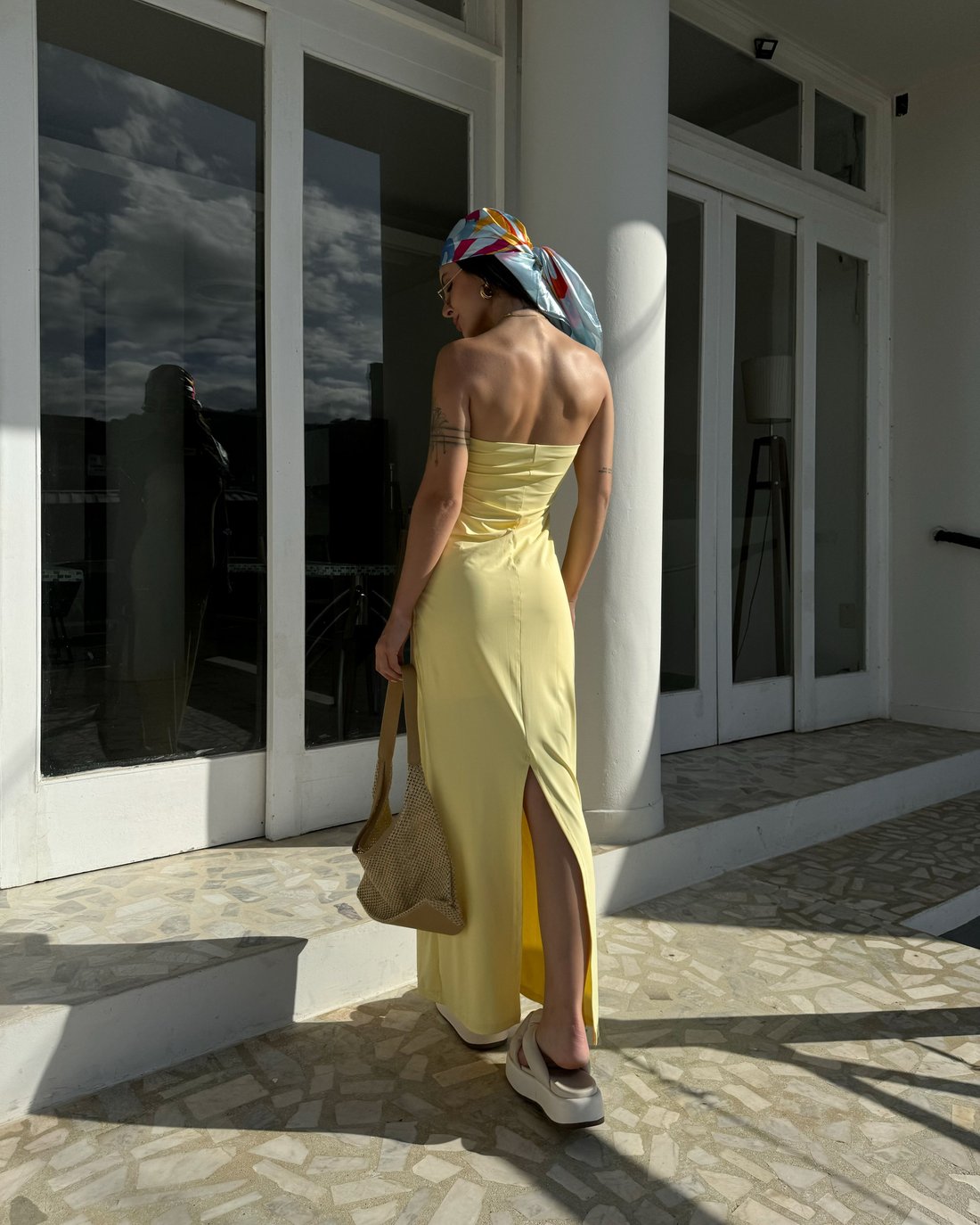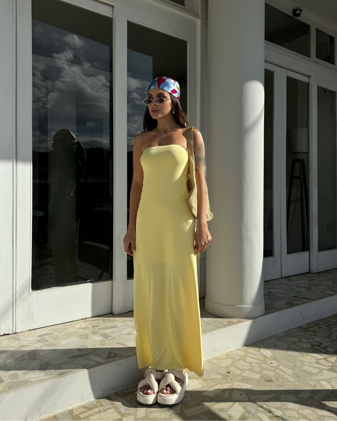 Vestido tomara que caia todo duplo, com elástico no busto pra se ajustar ao corpo e fenda atrás na parte debaixo. O tecido é de poliamida bem geladinha e amanteigada no corpo.